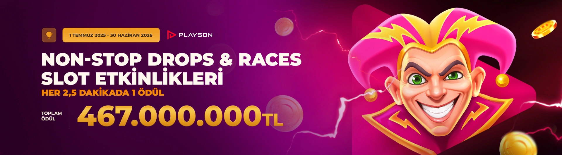✩ Playson Non-Stop Drops & Races Slot Etkinlikleri'nde 1 Temmuz 2026’ya kadar her ay 3 ayrı etkinlik gerçekleştirilecektir: Ek olarak yılda 4 kez CashDays X-TREME VIP turnuvaları düzenlenecektir.